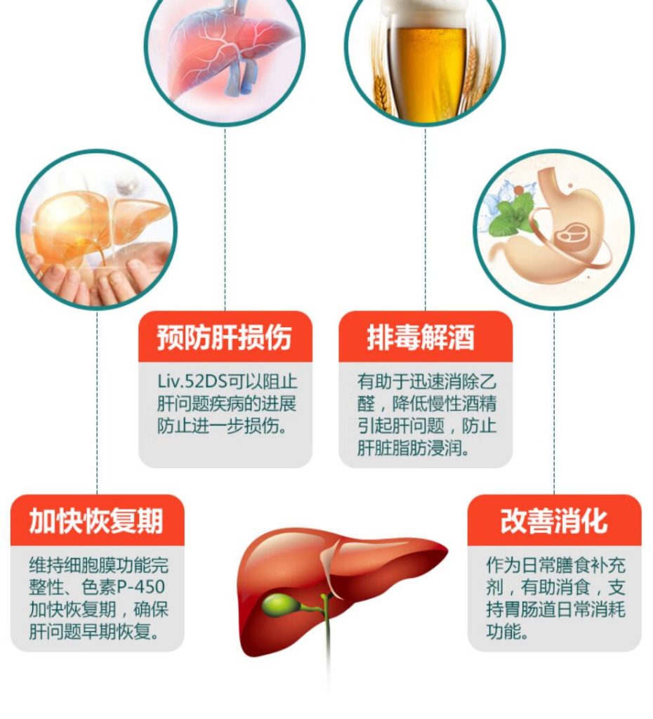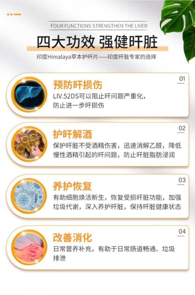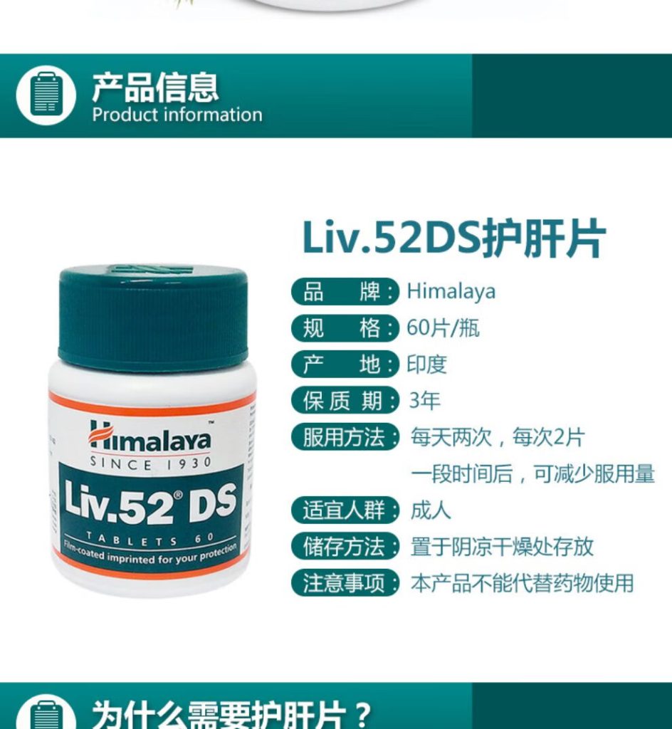 品牌:Himalaya名称:Himalaya Liv.52 DS 护肝片规格:60粒/瓶产地:印度适用人群:成人使用建议:1日2次,1次2粒, 餐后服用储存方式:25摄氏度以下阴凉处储存。密封盖若破损,请勿服用主要作用:预防肝损伤,改善消化,加快恢复